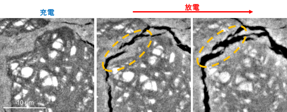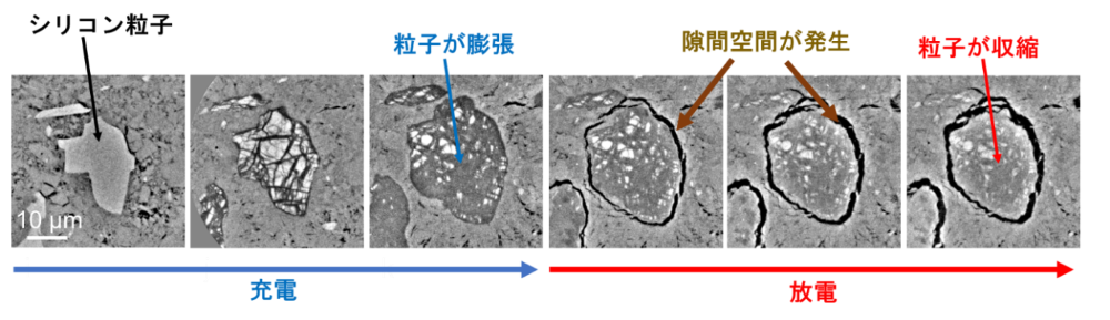 ●全固体電池作動中にシリコン負極が充放電反応で膨張・収縮するようすをとらえ、電極と固体電解質の接合部分に生じる微小な隙間(ボイド)や亀裂を観察しました。