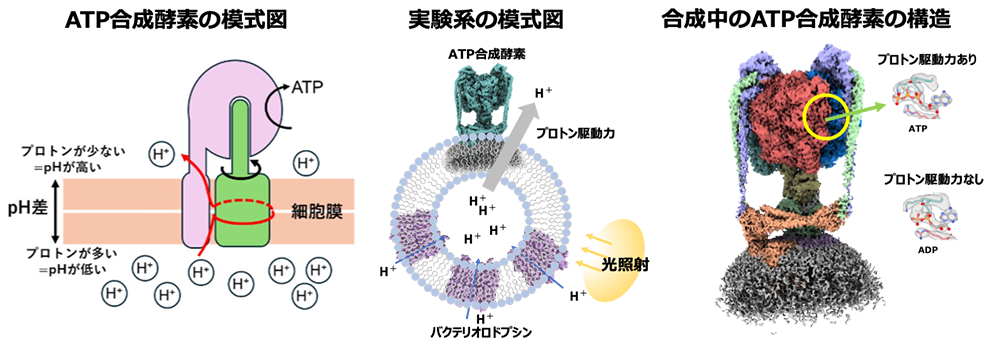 この反応が進行している瞬間を捉えるため、研究チームはリポソーム溶液を急速に凍結し、クライオ電子顕微鏡で観察しました。プロトン駆動力がない状態では、ATP合成酵素の触媒部位にADPが確認されました。プロトン駆動力がある状態では、触媒部位にATPが存在し、酵素が実際にATPを合成している構造が捉えられました(図1 右)。