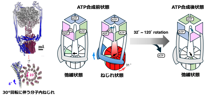さらに、膜に埋まったリング状の部分が約30°回転した構造が確認され、その際、膜内部分と膜外部分の間に「ねじれ」が生じていることがわかりました(図2 左)。このねじれは、回転運動が分子内で一度ねじれに変換され、その力が膜外部分の構造変化を引き起こし、ATP合成反応を進めることを示唆しています(図2 右)。