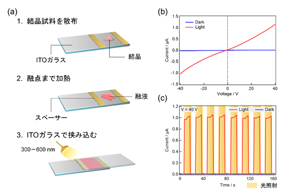 研究グループは、KGF-34(C6)が高い光伝導性を示すことを見出し、その伝導機構を明らかにしました。また、大型放射光施設SPring-8※7のビームライン(BL01B1, BL02B1, BL02B2, BL04B2)における放射光実験を通して、液晶転移や融解などの相転移に伴う構造変化を解明することに成功しました(図1b)。さらに、KGF-34(C6)の融解性を活用して薄膜デバイスを作製し、光検出器として応用可能であることを実証しました(図2)。加えて、導入するアルキル基の長さを変化させることで、半導体特性や融点、液晶特性の最適化に成功しました。
