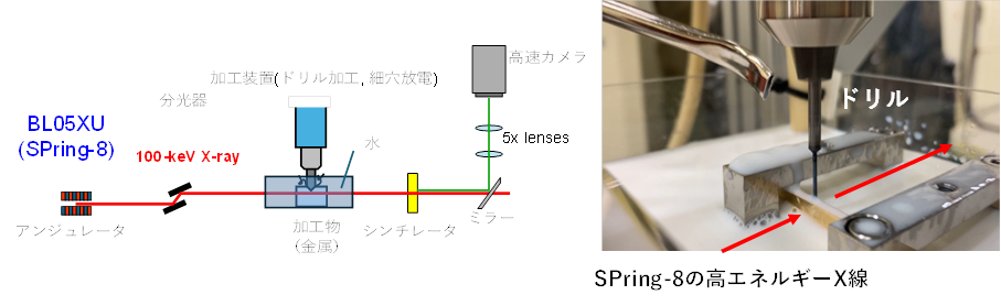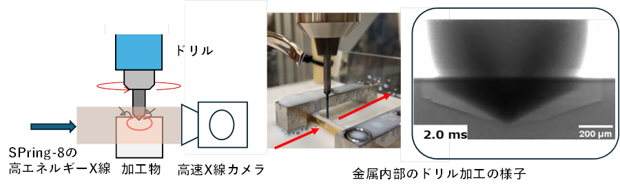 本研究では、図2に示すようにこの金属の透過力に優れたX線を、ドリル加工と放電加工の冷却液と金属内部を5000分の1秒の速さで観察、すなわち超高速レントゲン診断に用いました。