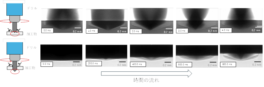 図3は、実際に銅合金をドリル加工した様子です。このように、鮮明に金属内部において工具により、金属が除去されていく様子を観察することに世界で初めて成功しました。さらに、ドリル工具の振動の様子もわかり、穴加工で防ぐべきバリの発生メカニズムも解明しました。本研究では、工業分野で重要な放電加工の観察にも成功しています。