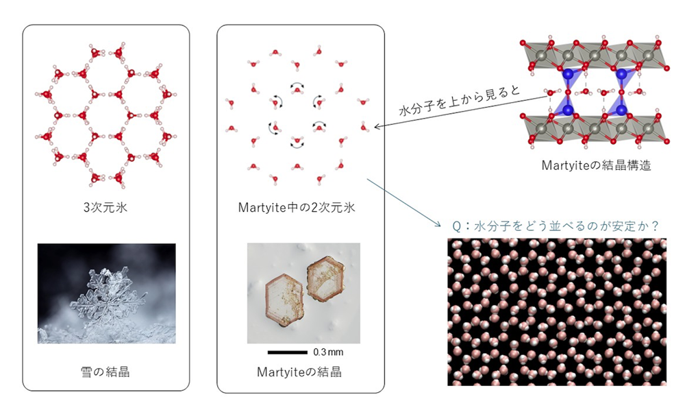 マーティアイトという鉱物中の水分子は、氷を一層だけ取り出して2次元に閉じ込めた、いわば単層氷とみなすことができます。本研究では、この単層氷が渦状の秩序構造(フェロアキシャル秩序)を示すことを発見しました。