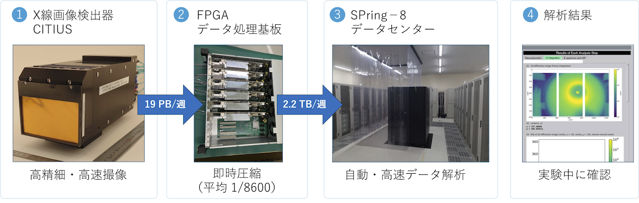 測定データの前処理、圧縮、転送、解析に至るまでのデータの流れを左から右へ示している。左から順に、① 毎秒27GBのデータを生成するX線画像検出器、② FPGAデータ処理基板を収めた計算機、③ SPring-8施設内のデータセンター、④ 高性能計算機上で動作する解析アプリケーションの結果表示画面を示す。