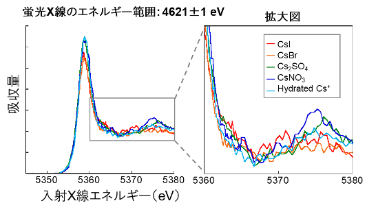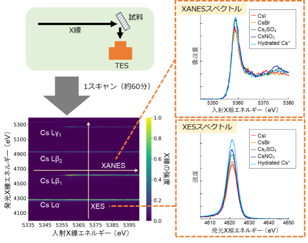 ◆超伝導転移端検出器(TES)を用いた高エネルギー分解能の蛍光X線分析により、X線吸収スペクトルのより微細な構造を検出し、セシウムの化学状態を詳細に推定しました。