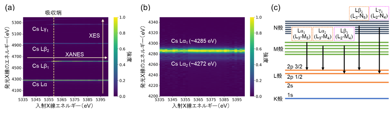 Cs含有試料にX線を照射し、吸収端(注5)の前後で入射X線のエネルギーを少しずつ変化ながら、蛍光X線をTESで検出しました。これにより、入射X線エネルギー、発光X線エネルギー、そして発光X線の強度、の三次元のデータを1回の測定で得ることができました(図1a)。この三次元データを水平方向に切り取ることでHERFD-XANESスペクトルを得ることができ、一方、この三次元データを垂直方向に切り取ることでX線発光スペクトル(以下、XES)(注6)を得ることができます。