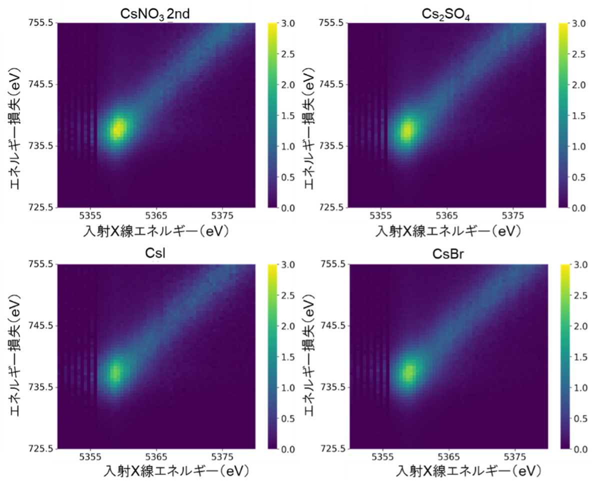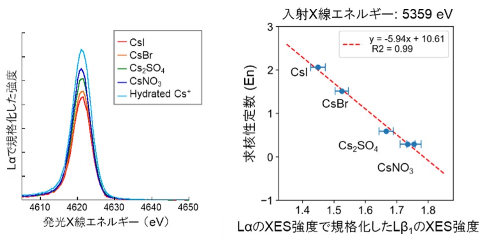 HERFD-XANESスペクトルでは、Cs化合物に応じて異なる特徴が見られました(図2)。これらの違いはCs化合物の結合性の違いに由来すると考えられます。Cs化合物間の違いは、XESスペクトルでも確認されました。蛍光線Lβ1のXESスペクトルの強度をLα1の強度で規格化したところ、各化合物の求核性定数 En と強い相関が見られました(図3)。En は共有結合性を定量化した指標であるため、今後、未知試料についても測定を行うことで共有結合性の定量ができると考えられます。こういった化合物間の違いは、RIXSマップ(図4)でも見られました。