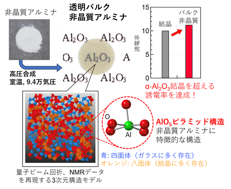 酸化アルミニウム(Al2O3、アルミナ)は、高強度、化学安定性、耐摩耗性、耐食性、電気絶縁性などの優れた物性を併せ持ち、セラミックス基板、半導体製造装置部品、自動車排ガス触媒、工業用研磨材、耐火材などの幅広い産業分野で利用されています。アルミナの多くは原子が規則正しく配列した結晶ですが、一部は原子配列に規則性を持たない非晶質(アモルファス)※1のアルミナです。アルミニウム金属を電気化学的に酸化すると薄膜状の多孔質非晶質アルミナが得られ、電子部品、コーティング材などとして利用されています。身近な日用品(やかん、鍋、弁当箱など)の表面にも耐食・耐久性向上を目的に非晶質アルミナ膜が形成されています(アルマイト処理)。一方、代表的な非晶質材料といえばガラス※2(窓ガラスのような厚みのある塊(バルク)状態の非晶質物質)ですが、アルミナは古くから「ガラスにならない酸化物」とされ、従来の溶融法ではガラスを作ることはできません。そのため、非晶質アルミナの研究は薄膜・多孔体・ナノ粒子に限定され、緻密なバルク非晶質アルミナを合成することはできませんでした。