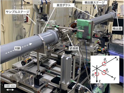 SPring-8の長尺ビームラインを利用した評価システム。地上で天体からの平行なX線を再現できる。