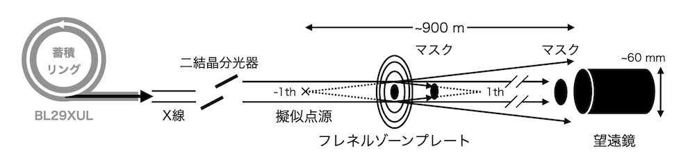 フレネルゾーンプレートなどのX線光学素子を用いて仮想的な点光源を生成し、約1 kmの長距離伝搬により天体から到来するほぼ平行なX線を模擬する