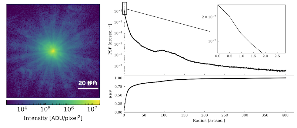 図4:X線望遠鏡によって得られた結像イメージ(左)と、その点像分布関数PSF(右上)および累積動径カウント関数EEF(右下)。本研究では、FWHM 0.7秒角、HPD 14秒角の高い解像度を達成した。
