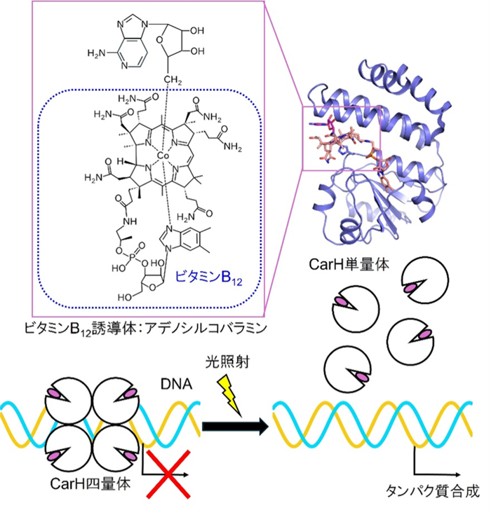 図1 CarHの構造と機能。CarHは光を感知するためにビタミンB12を利用している。CarHが光を受けると四量体から単量体へと構造が変化し、DNAに結合できなくなる。
