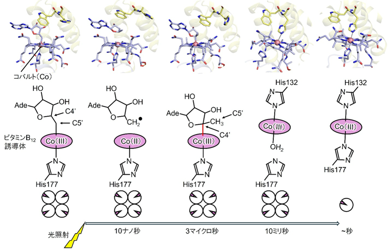図2 XFEL施設SACLAでの時間分解構造解析で明らかとなったCarHの光活性化の仕組み。本研究では、光照射の3マイクロ秒後にCo-C4’結合をもつ新たな反応中間体を発見した。